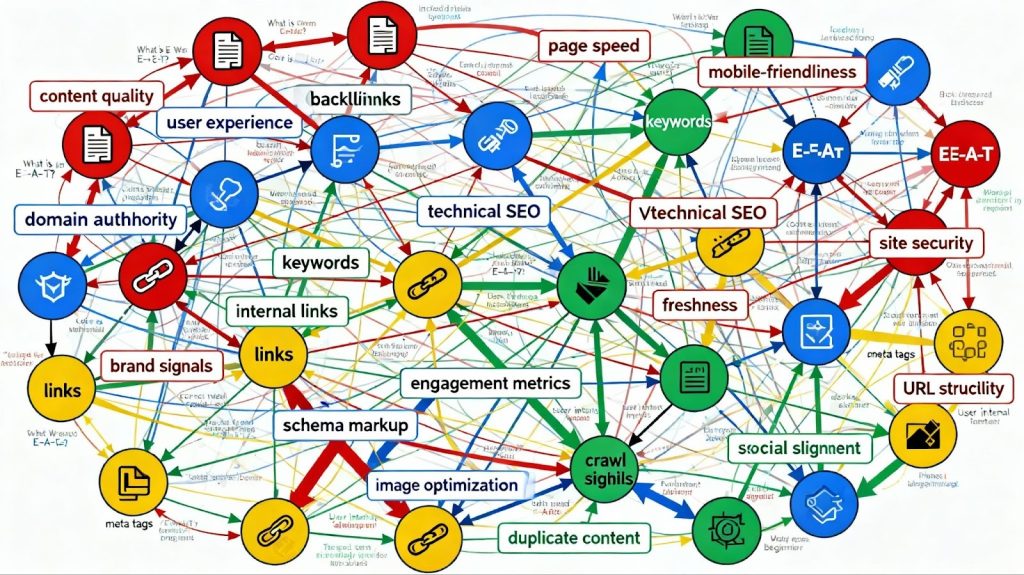 There are hundreds of primary factors, along with thousands of micro-signals, that search algorithms take into consideration while determining a website’s SEO score. To give you an idea, I have attempted to show various factors and their inter-dependence on determining a website’s SEO score-