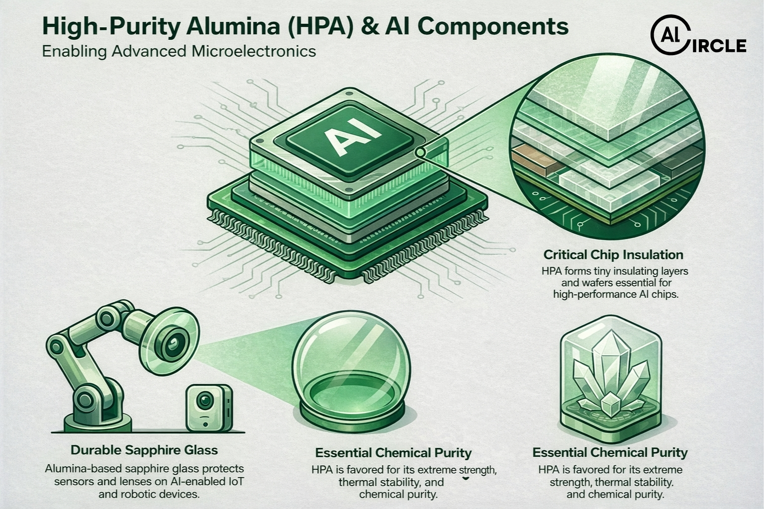 - Chip Components: High-Purity Alumina (HPA) is in high demand to form the tiny insulating layers and wafers within AI chips. HPA is favoured for its chemical purity, strength and thermal stability.