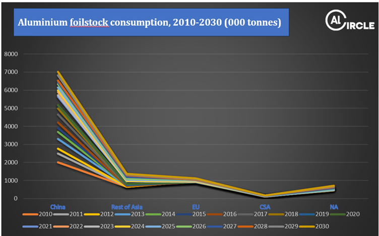- China market analysis : China remains the largest consumer, with consumption projected to rise from 2 million tonnes in 2010 to an estimated 7.0 million tonnes by 2030. This makes China a critical focus market for aluminium foilstock manufacturers and investors.