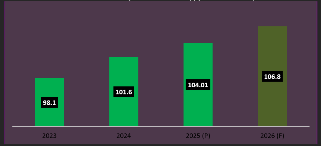 Market data analysis projects global aluminium consumption rising from 101.6 million tonnes in 2024 to 104.0 million tonnes in 2025 (provisional) and reaching approximately 106.8 million tonnes by 2026 (forecast).
